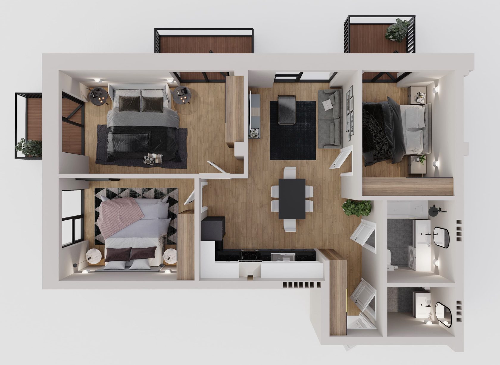 דירות 3 החדרים בפרוייקט היוקרה שלנו מורכבות משלושה חדרי שינה גדולים, מטבח, 2 חדרי אמבטיה, חדר הלבשה, מרפסת מרווחת.